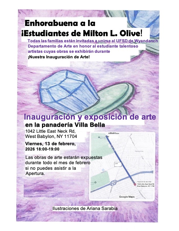 Congratulations to 24 students from Ms. Fucci’s 6th grade classes at MLO who were selected to have their artwork displayed in a small exhibition at Villa Bella Bakery on East Little Neck Road in West Babylon. This project focuses on color theory and the relationships between colors. Students explored how colors interact by selecting a specific color scheme and creating fun, unique “ring pop” artworks that highlight contrast, harmony, and visual impact.